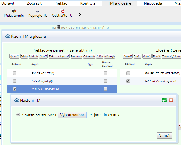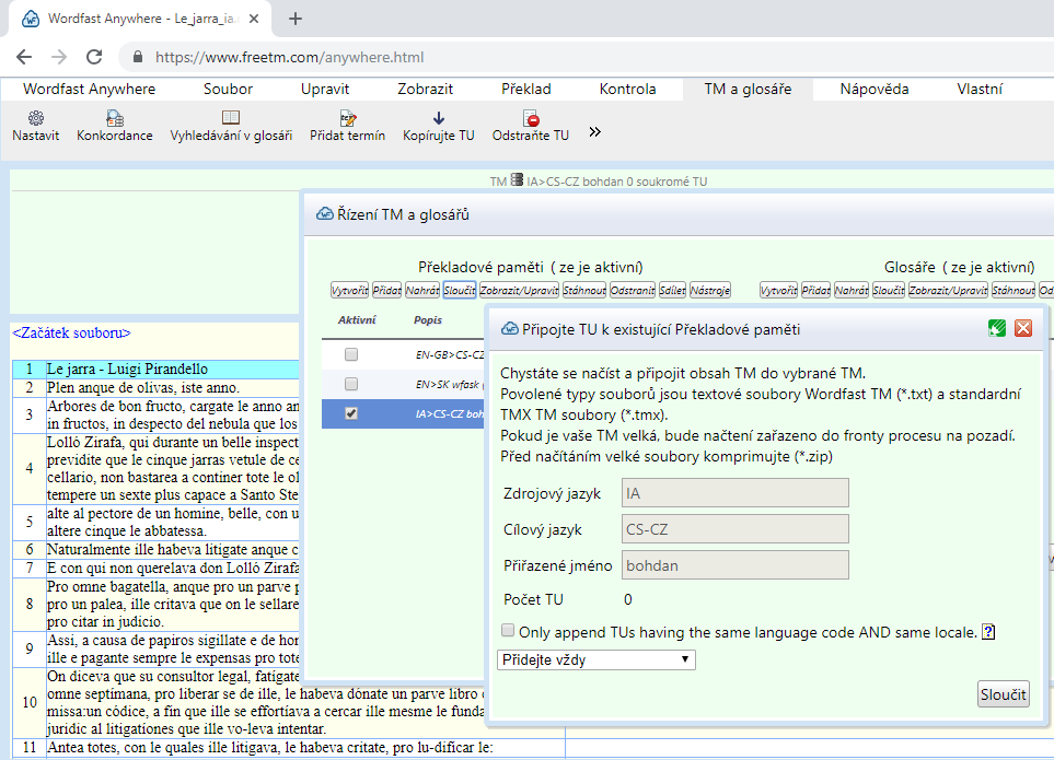 Připojte TU k existující překladové paměti